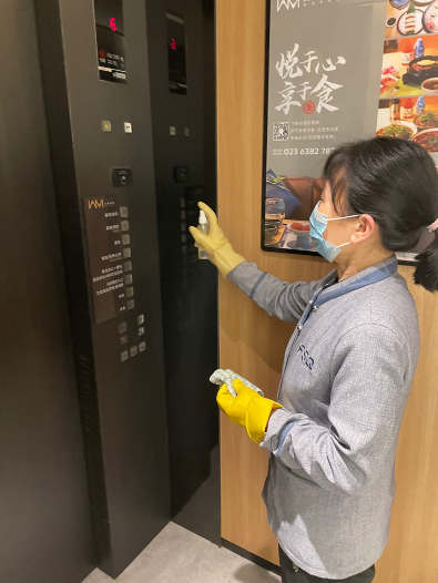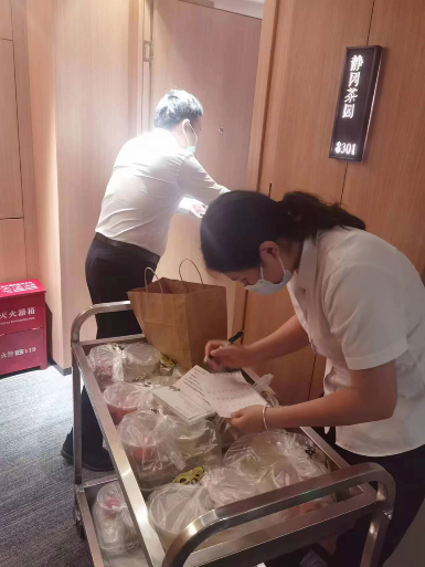 餐饮部做好了餐食,送餐却成了难题。“隔离第一天电梯就停运了,这对我们客房部是很大的困难——因为客房分布在各个楼层,工作车推不上楼,只能靠我们一次次的爬楼梯去给客人送饭”,总助兼销售经理薛仕源虽然平时主要负责协调统筹工作,但他也参与到饭食分发队伍当中:“送餐时还要留心观察客人的情绪,我遇到了一位情绪异常暴躁的客人,当时不断跟客人解释酒店封控原因,还当着他的面跟社区沟通询问封控时间,并保证解封后第一时间通知客人,这样慢慢取得了客人的信任。很开心的是,这个曾经暴躁的客人离店前还特意买了冰淇淋赠送给我们的员工,并表示后续到重庆都会指定住我们酒店。”