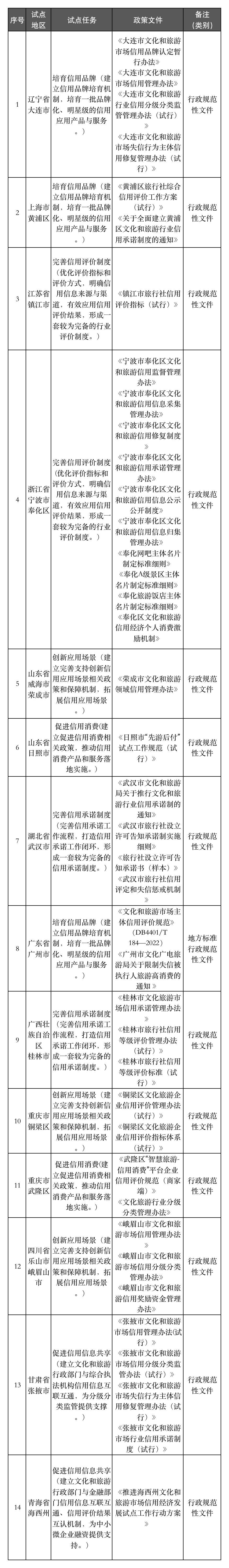 文化和旅游市场信用经济发展试点地区出台政策文件一览表