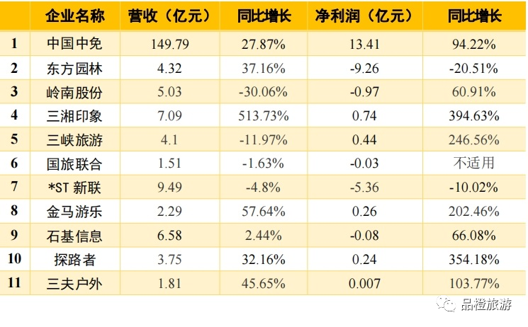 据11家上市企业的财报数据,在营收方面,岭南股份(002717)、国旅联合(600358)、三峡旅游(002627)、*ST新联(000620)同比呈现负增长;在净利润方面,东方园林(002310)以-9.26亿元成为亏损王,三湘印象(000863)、三峡旅游(002627)、金马游乐(300756)、探路者(300005)的增长同比均超过200%。
