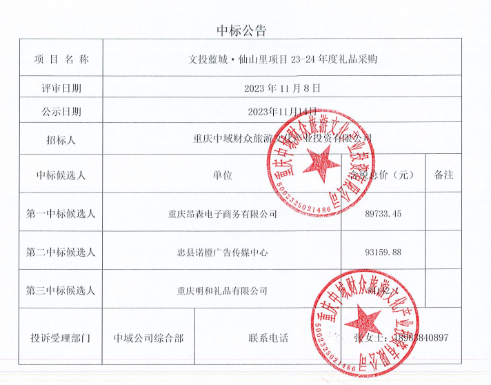 文投蓝城·仙山里项目23-24年度礼品采购中标结果