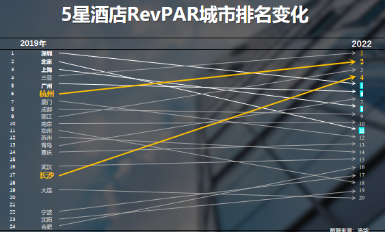 2023年初,浩华提供了一份2019年至2022年“5星级酒店RevPAR城市排名变化”的资料。结果显示,2019年排名前三的深圳、北京、上海在2022年分别下降至第五、第十一和第八,广州也由2019年的第五下降至2022年的第六。2022年排名前五位的分别是:三亚(2019年居第四位)、杭州(2019年居第六位)、丽江(2019年居第9位)、长沙(2019年居第17位)和深圳(2019年居第一位)。