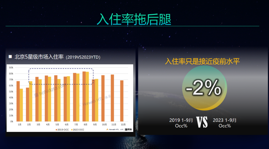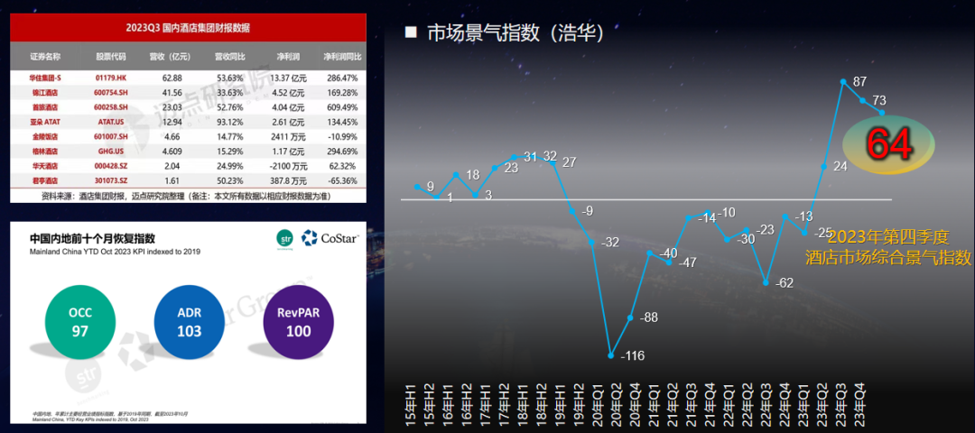 探究上述背离的底层逻辑,可以大致集中在三个层面:从宏观层面看,源于行业面对的诸多不确定性,如宏观经济下行压力,地缘政治博弈日趋激烈,这些因素传导到酒店业,使得行业复苏的节奏和轨迹与以往明显不同;从中观层面看,受房地产因素的影响,酒店行业从股权结构到商业模式都面临着一次大拆解,传统商务需求明显萎缩;从微观层面看,尽管2023年RevPAR数据较2019年还算过得去,但出租率指标总体上较为低迷。大家在2023年初寄予厚望的流量“井喷”只出现于个别地区的个别时间段,总体上看并没有全面显现。