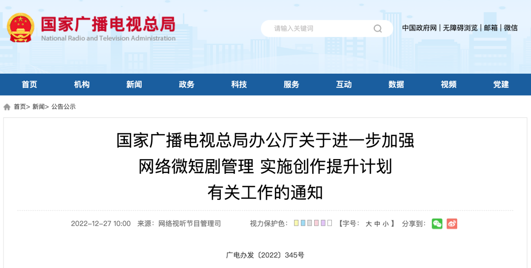 2022年4月,总局下发《关于国产网络剧片发行许可服务管理有关事项的通知》,规定自2022年6月1日起,包括网络微短剧在内的国产重点网络剧上线时,将使用统一的“网标”,进一步规范微短剧形式。