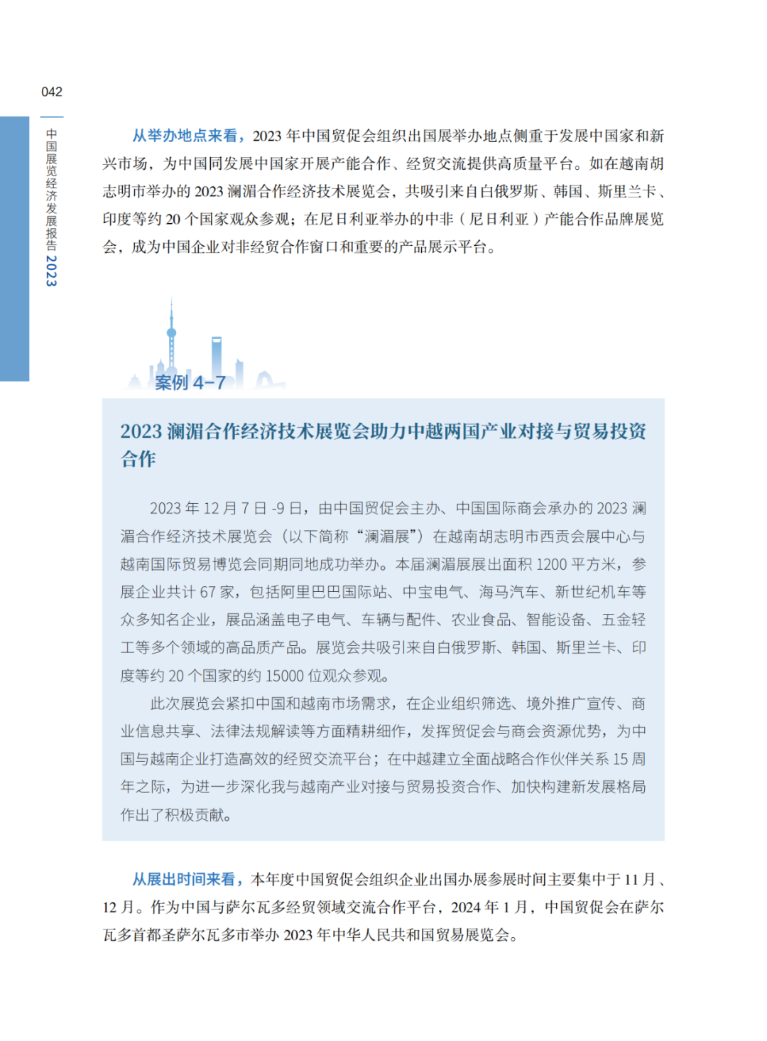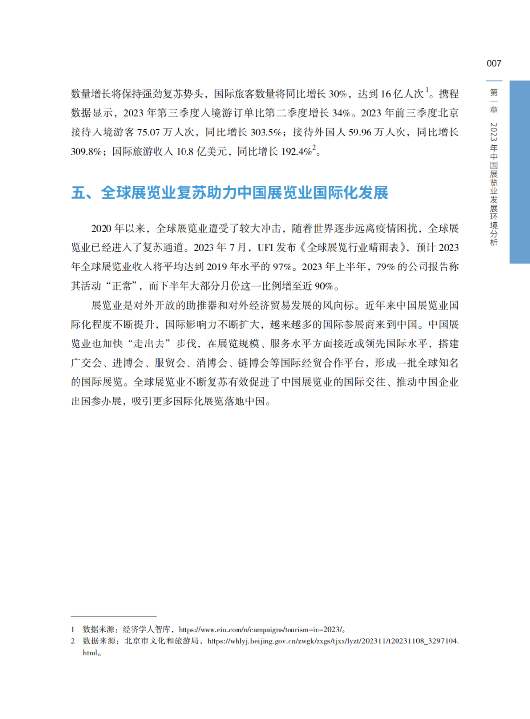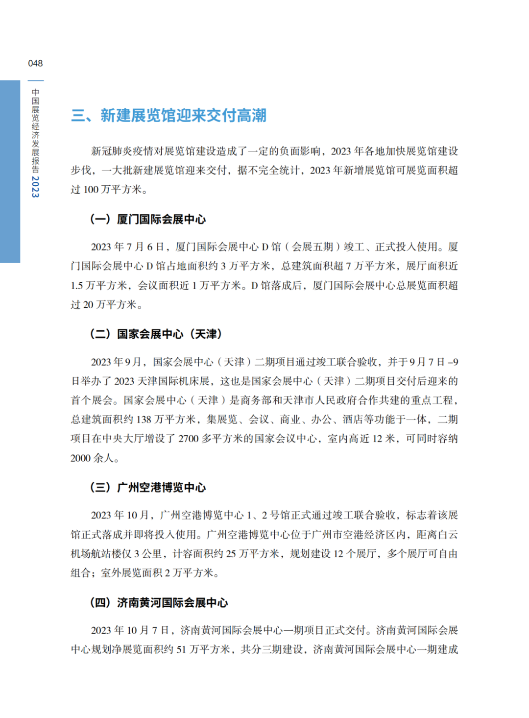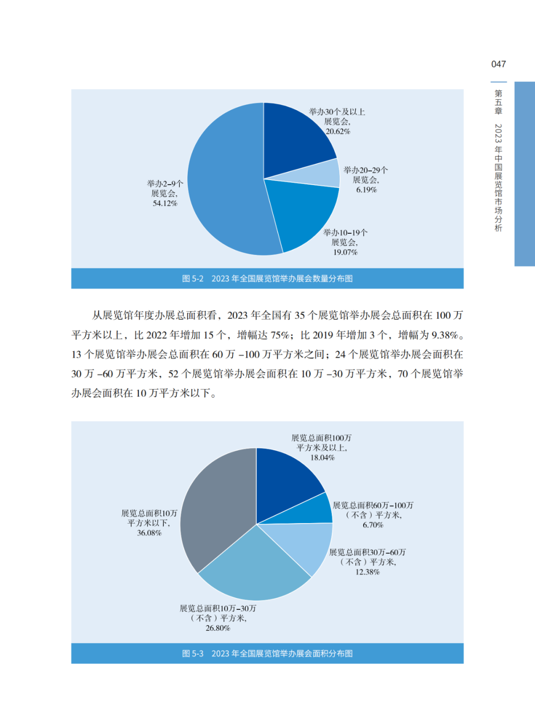 中国贸促会展览管理部部长邬胜荣介绍,2023年,中国展览业发展呈现五大特征:中国经贸类展会全面恢复至疫情前水平;展览业经营主体经营情况不断恢复向好;企业重启出国参办展,加大市场开拓力度;国家级展会成为引领展览业复苏排头兵;展览馆实际运营数量和利用率大幅提升。