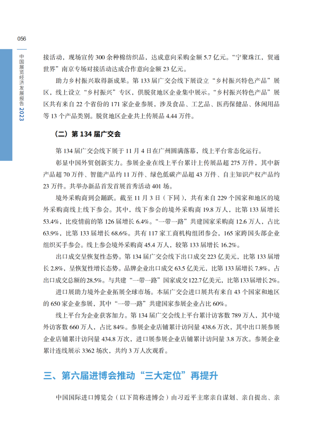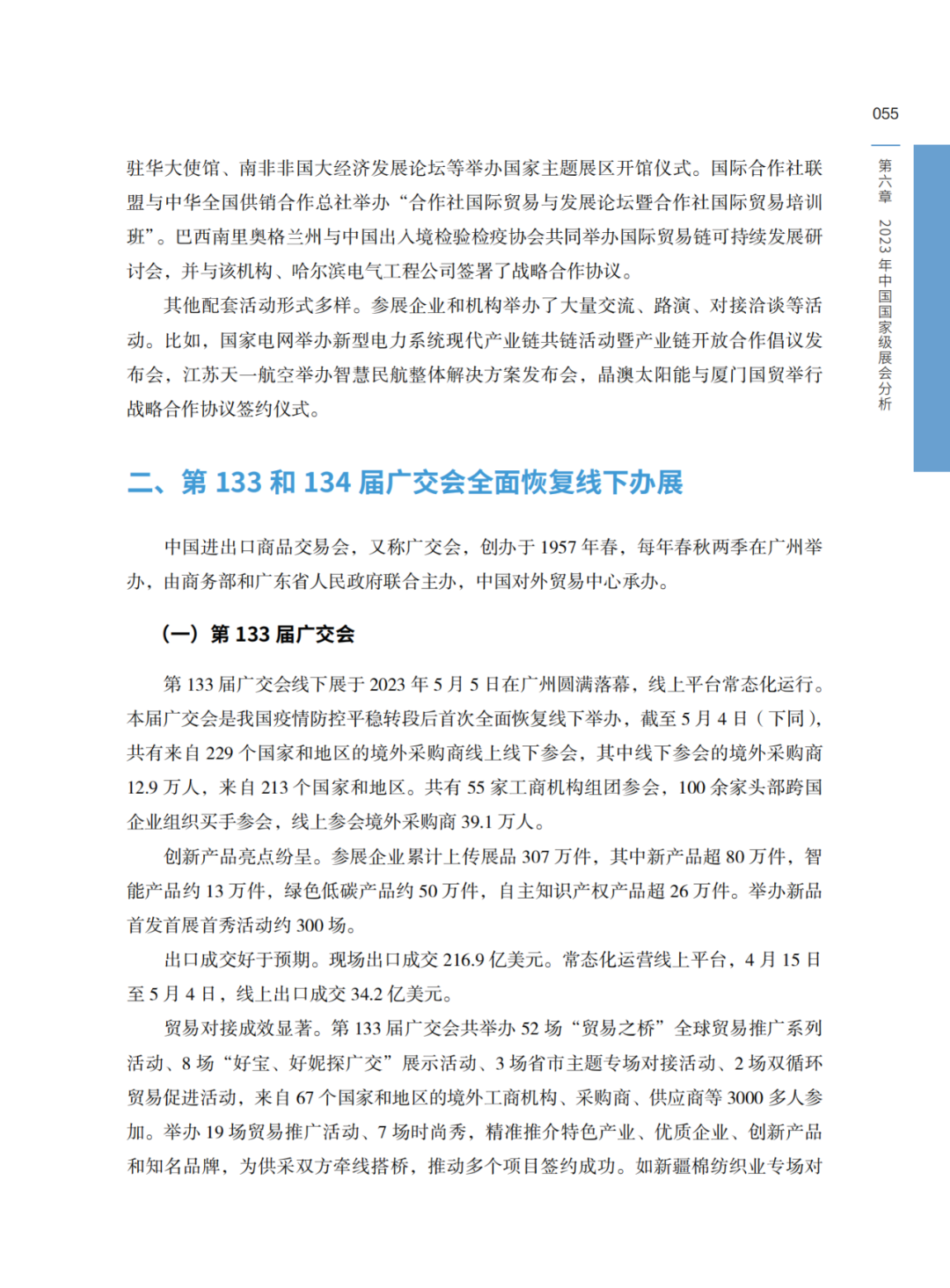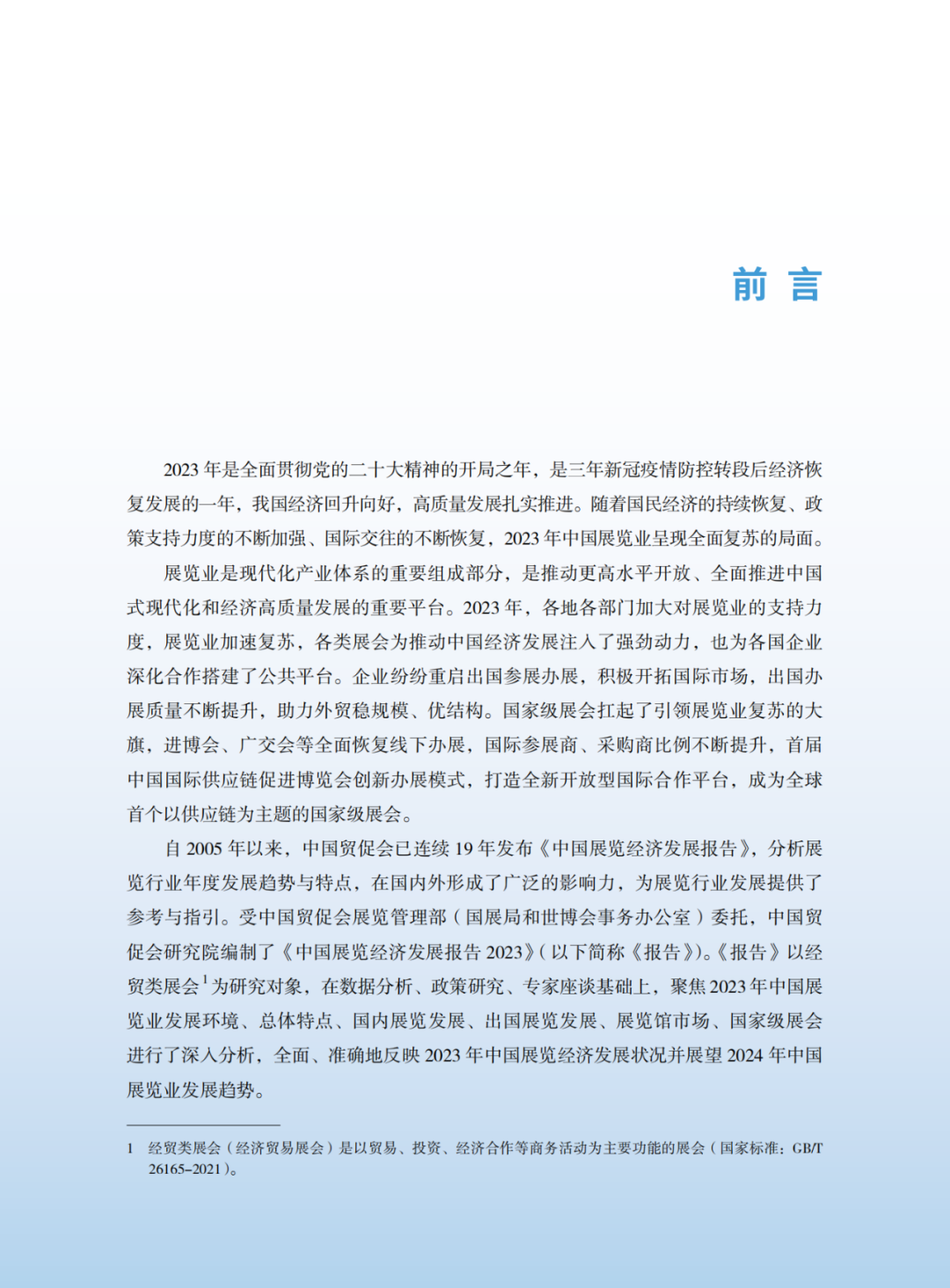 报告显示,国家级展会成为引领展览业复苏排头兵。2023年,各国家级展会全面恢复线下展,进博会、广交会、消博会等展会在规模、成效等方面全面超越疫情前水平。