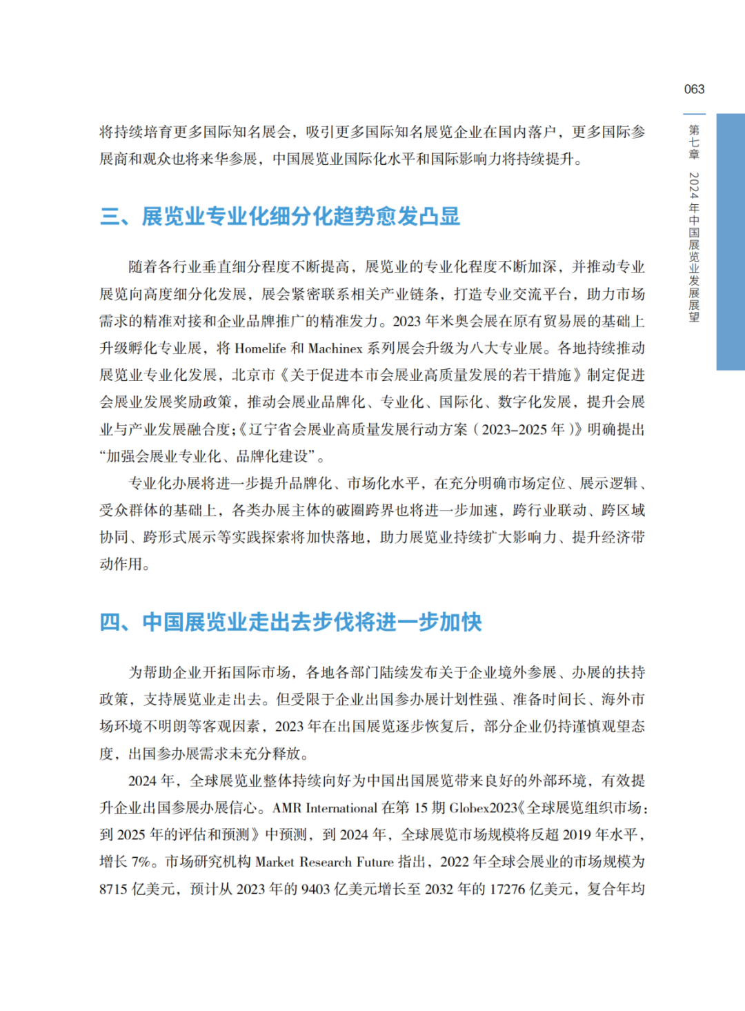 邬胜荣表示,2024年,中国展览业将在经济复苏中继续发挥重要作用,国际影响力将持续扩大,展览业专业化、细分化趋势愈发凸显,“走出去”步伐将进一步加快,标准化规范化水平将进一步提升,技术进步将推动展览业加速转型升级。