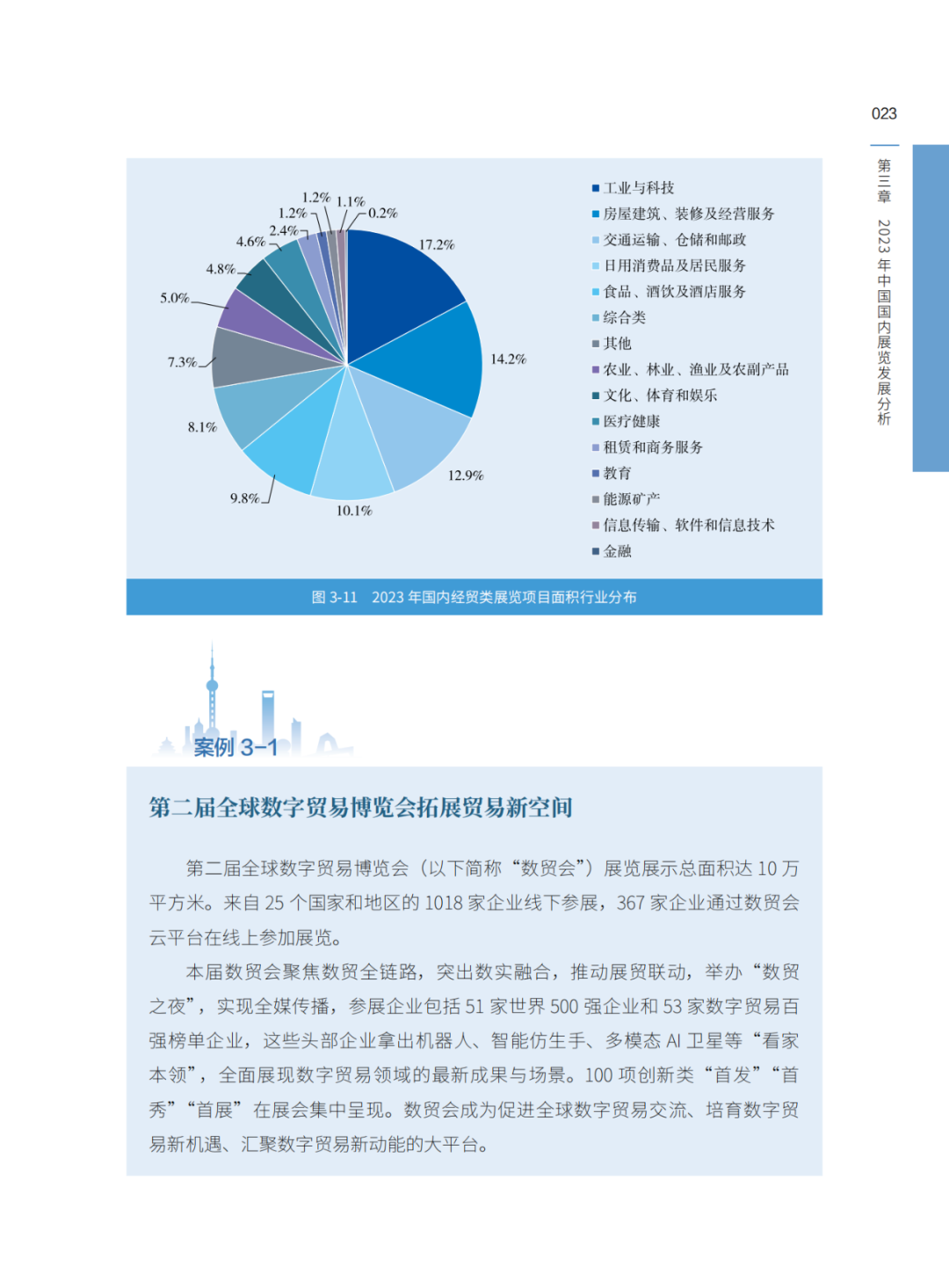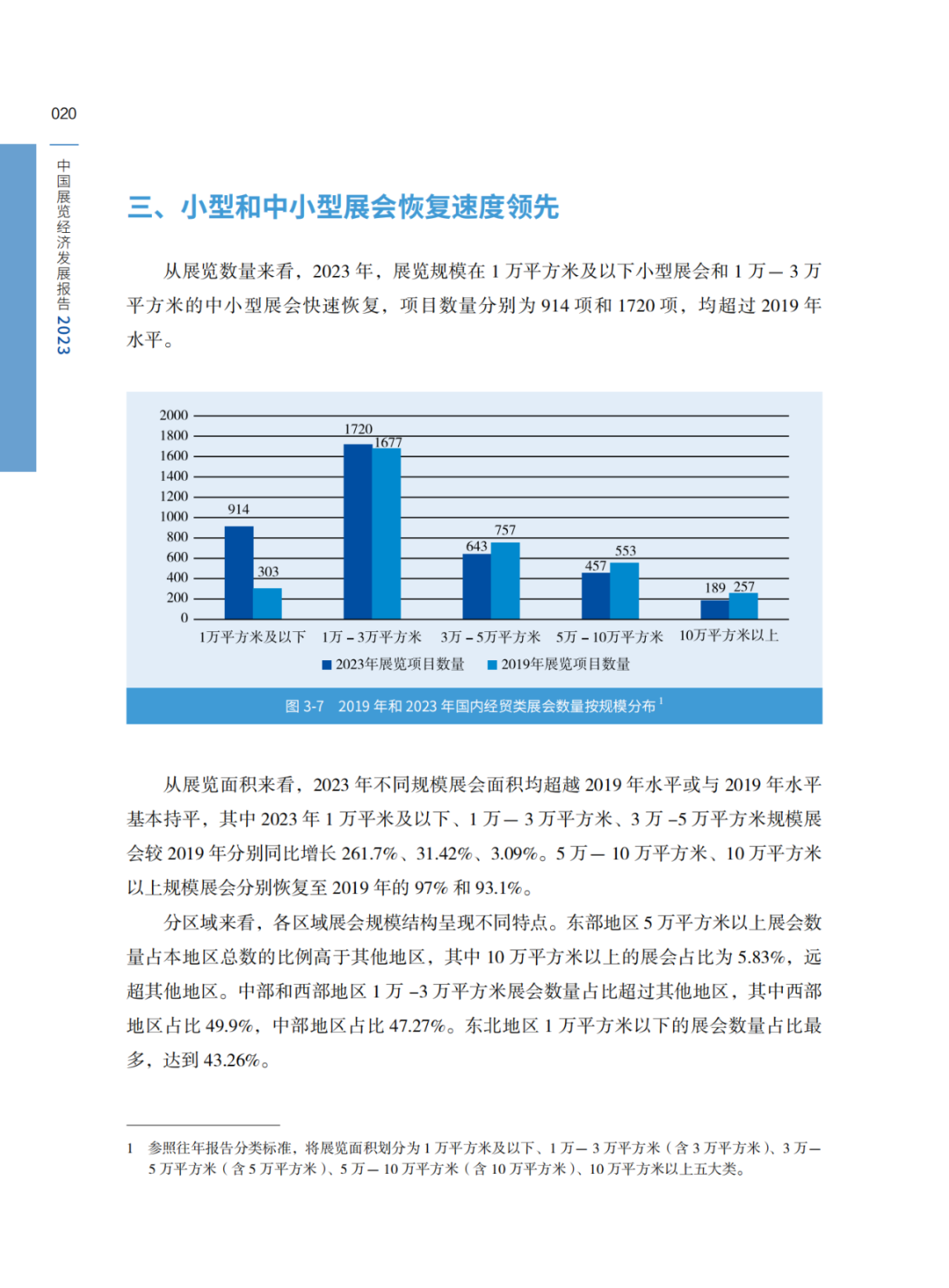 2023年中国共举办经贸类展会3923场,较2022年增长117.1%,较2019年增长10.6%;办展总面积1.41亿平方米,较2022年增长153.3%,较2019年增长8.25%。