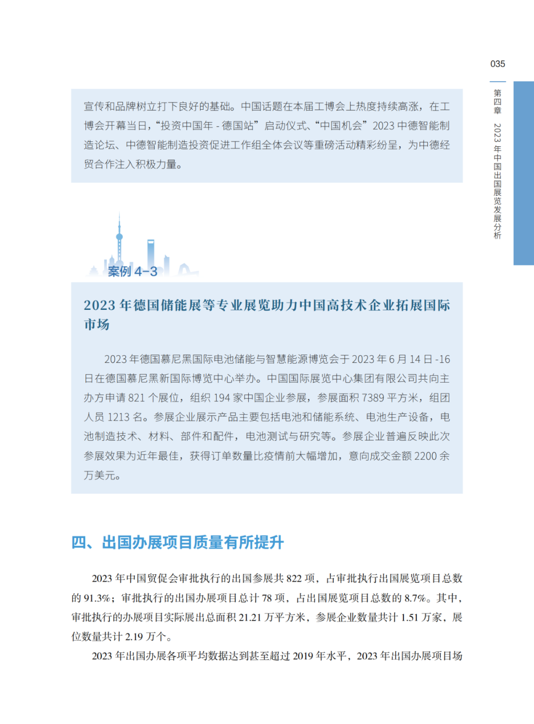 随着国际交往的逐渐恢复、经济形势不断复苏向好,中国国内企业纷纷重启出国参展办展,加大力度开拓国外市场。数据显示,2023年中国贸促会审批通过并实际执行出国展览项目900项,涉及55个国家或地区,展览面积57.22万平方米,参展企业共计3.96万家。其中,出国办展78项,占出国展览项目总数的8.7%。出国办展项目质量有所提升,2023年出国办展各项平均数据达到甚至超过2019年水平。