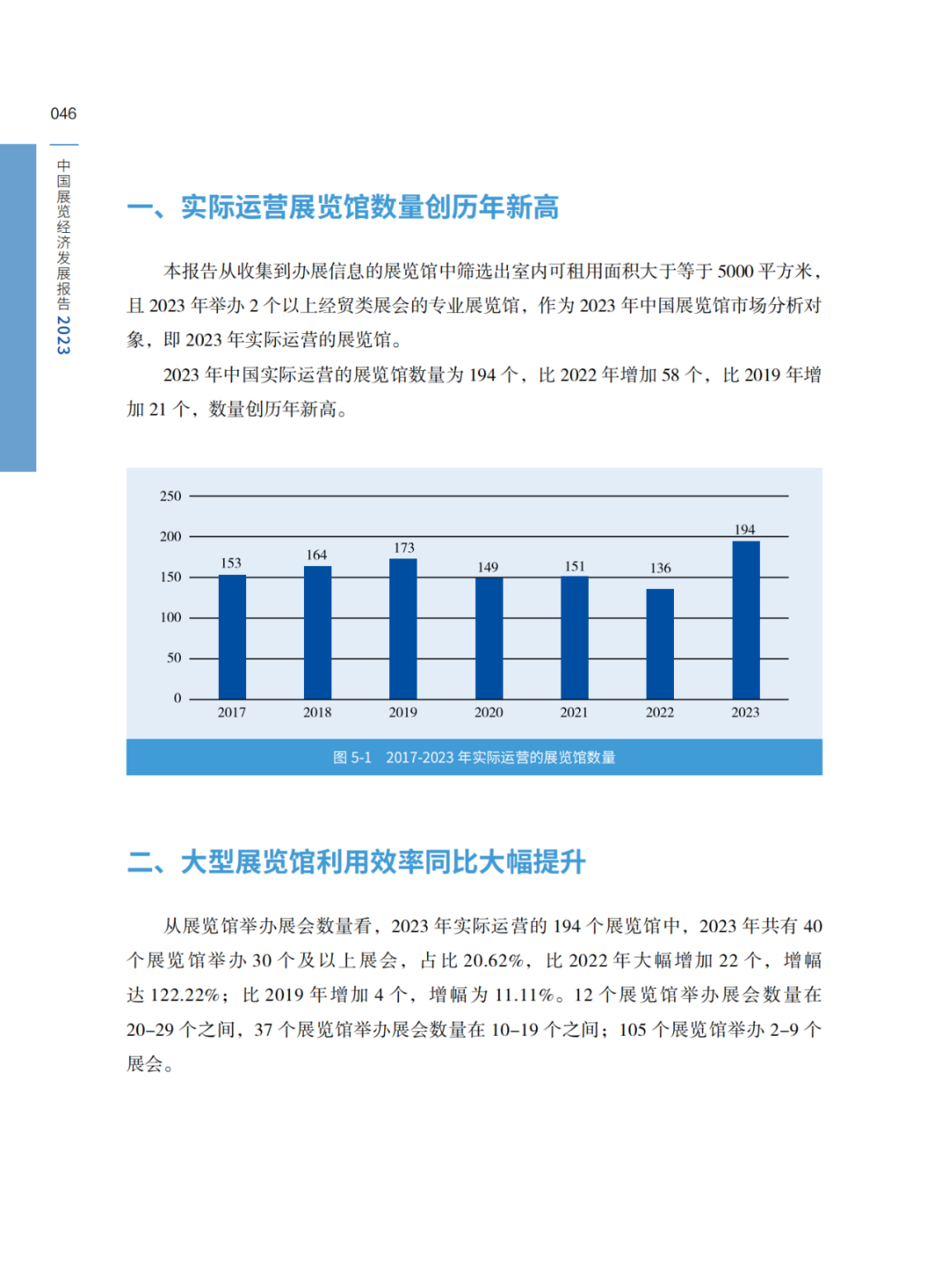 展览馆实际运营数量和利用率大幅提升。2023年实际运营的展览馆数量为194个,数量创历年新高。2023年各地加快展览馆建设步伐,新建展览馆迎来交付高潮,据不完全统计,2023年新增展览馆可展览面积超过100万平方米。